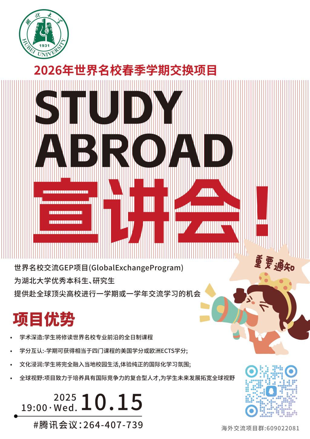为拓展学生国际视野,培养具备全球竞争力的高素质人才,我校拟选拔优秀学生赴哥伦比亚大学、宾夕法尼亚大学等世界顶尖学府进行交流学习。为了帮助同学们更好地了解项目详情,特举办项目线上宣讲会。项目线上宣讲会定于10月15日(周三)举行,届时将详细介绍各校优势,并于10月16日(周四)组织线下答疑,欢迎感兴趣的同学积极参加。