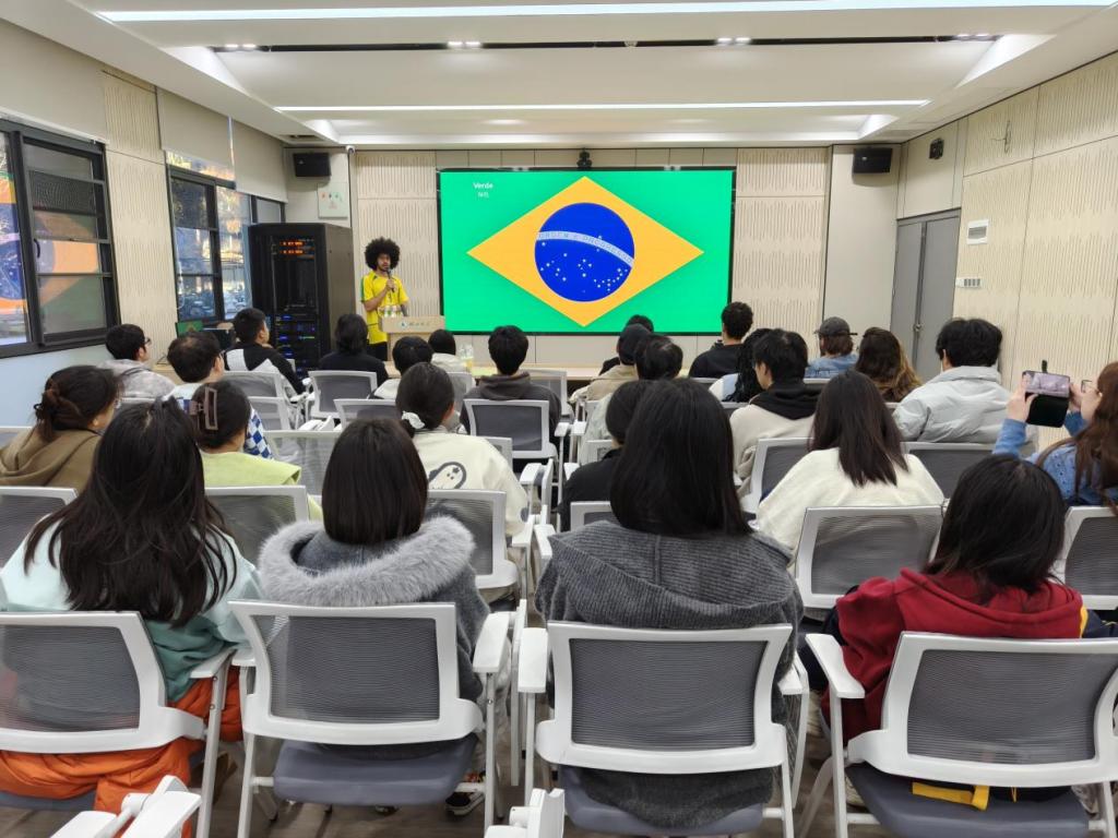 11月28日,我校巴西籍教师米格尔(HERNANDES DOS SANTOS MIGUEL)在团结学生公寓“一站式”学生社区102思德报告厅担任主讲,为学生开启一场巴西文化之旅。