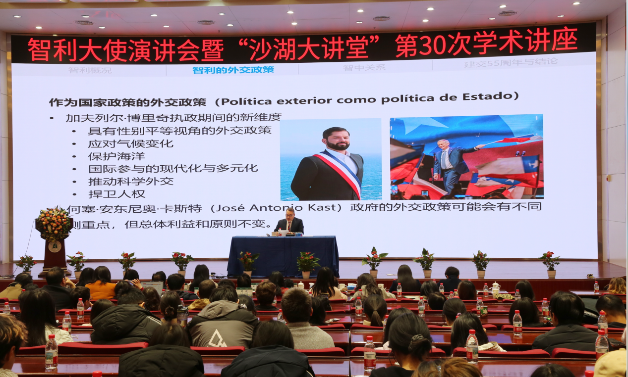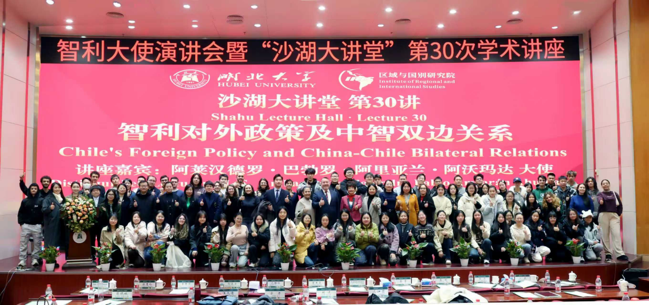2026年1月16日,智利驻华大使阿莱汉德罗·巴勃罗·阿里亚兰·阿沃玛达(Alejandro Pablo Arriarán Ahumada)应邀访问湖北大学,并为师生带来“沙湖大讲堂第三十讲”——《智利对外政策及中智双边关系》的专题讲座。湖北大学国际交流与合作处、区域与国别研究院等相关负责人及百余名中外师生参加了本次活动。讲座由湖北大学区域与国别研究院院长吴洪英教授主持。