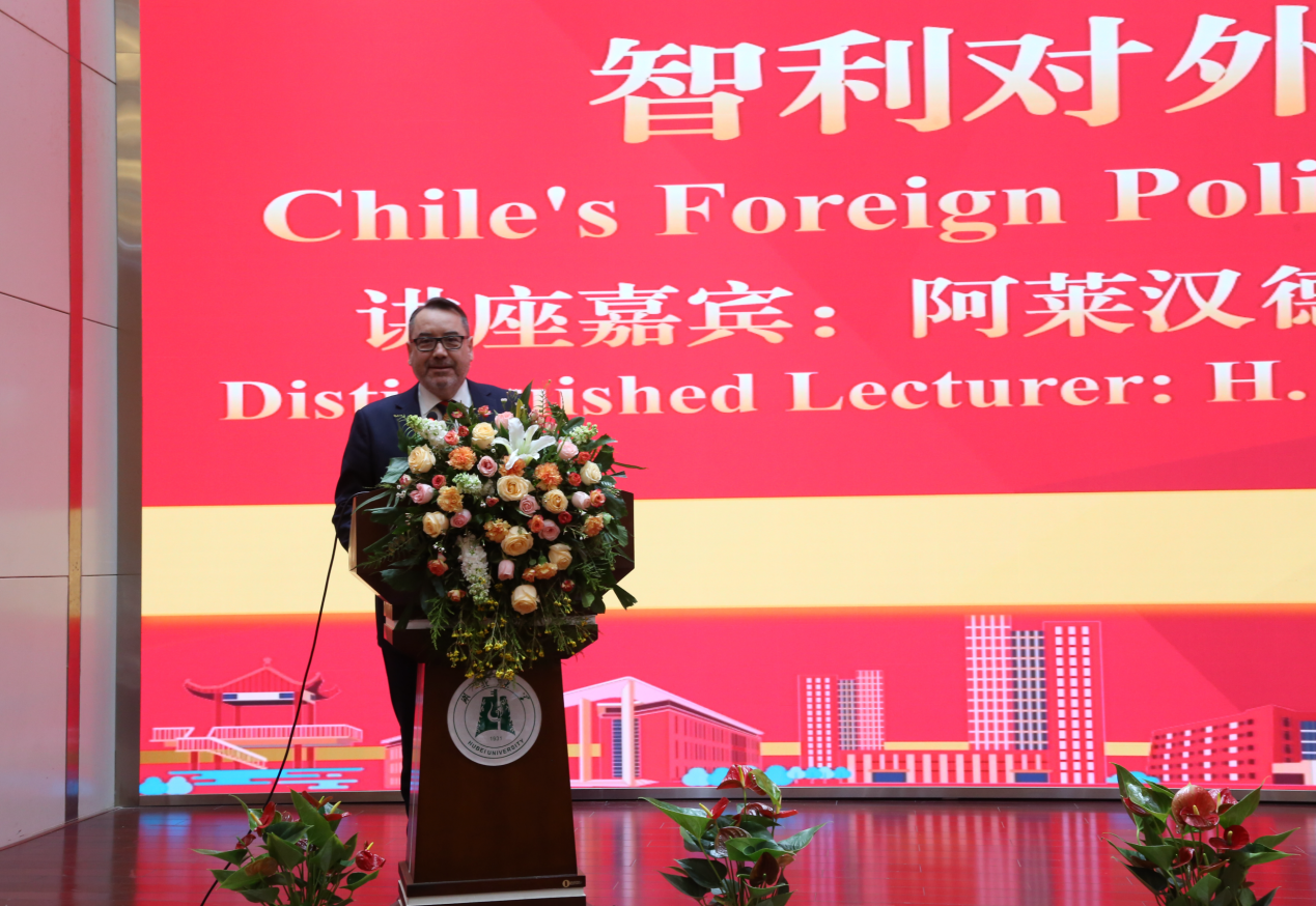 随后,阿里亚兰大使为师生带来了《智利对外政策及中智双边关系》的专题讲座。他表示,能来到拥有悠久拉美研究历史底蕴的湖北大学,对他而言是一份意义非凡的荣誉。大使以“智利对外政策及中智双边关系”为题展开深入讲解,并从地理、历史、政治、经济、文化等多个角度介绍了智利的国家概况。智利地形独特,南北绵延4300公里,坐落于安第斯山脉与太平洋之间,是世界上最长的国家之一。作为南美洲最开放的经济体之一,智利拥有覆盖全球的自由贸易协定网络,经济竞争力和社会发展水平位居拉美前列。