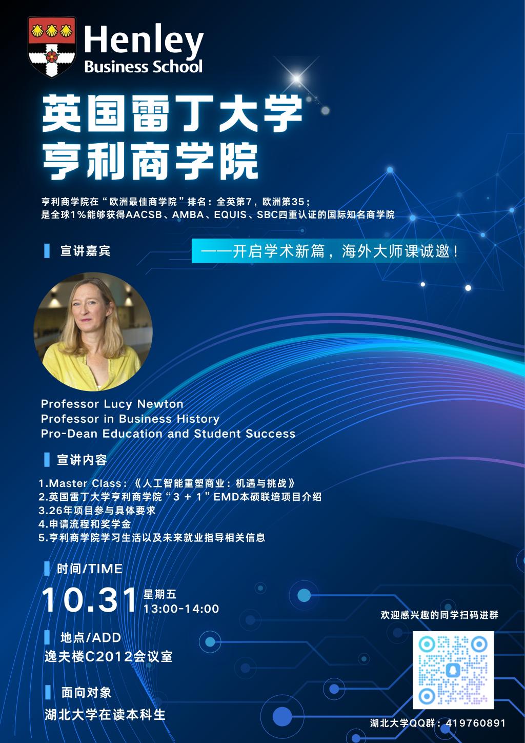 为帮助在校生拓展全球视野,提升学术素养,我校特邀请英国雷丁大学亨利商学院副院长Lucy Newton教授将为我校学生带来主题为《人工智能重塑商业:机遇与挑战》的专题讲座并介绍“3+1”EMD本硕联合培养项目。届时,Lucy Newton教授将与同学们进行深度学术交流,为大家解读商科前沿动态与未来发展路径,欢迎感兴趣的同学前来参加。